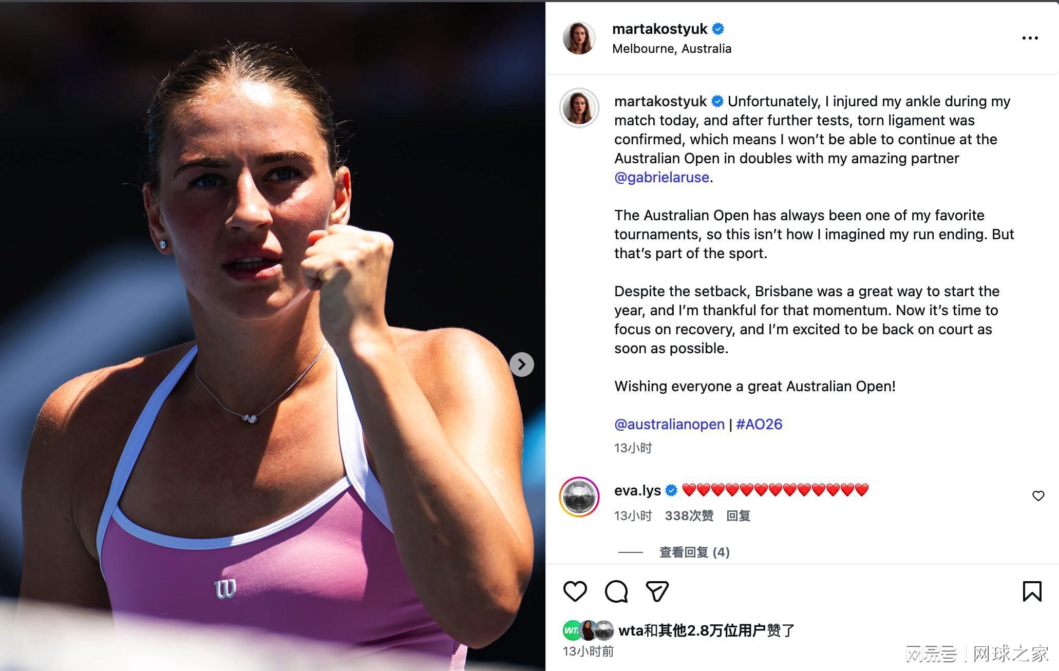 北京时间2026年1月18日,乌克兰名将科斯秋克在澳网女单首轮经历了一场三小时三十一分钟的鏖战,最终在三个抢七大战后不敌法国小将雅克莫。比赛末段,科斯秋克在一次跑动中摔倒,赛后确诊为韧带撕裂,她也因此退出了女双比赛。这位一周前刚在布里斯班站连克三位世界前十并闯入决赛的乌克兰美女,在澳网开赛第一天就遭遇了状态和命运的双重逆转。科斯秋克的2026赛季开局堪称梦幻...